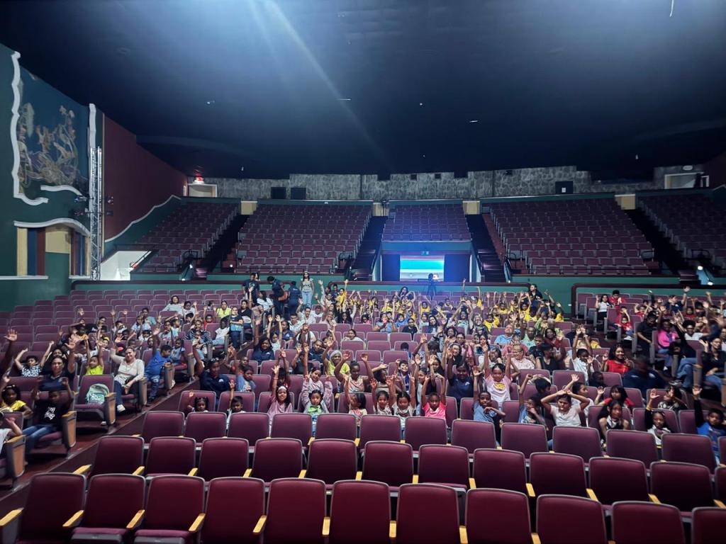 300 Niños, niñas y adultos mayores fueron a ver la obra «Historia de un Punto y de una Línea» al Teatro Balboa, agosto. 2025